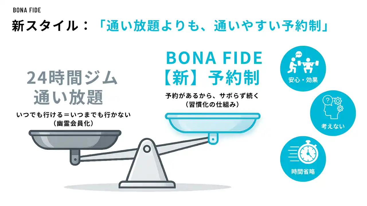 新スタイル:通い放題24時間より、通いやすい予約制ジム |