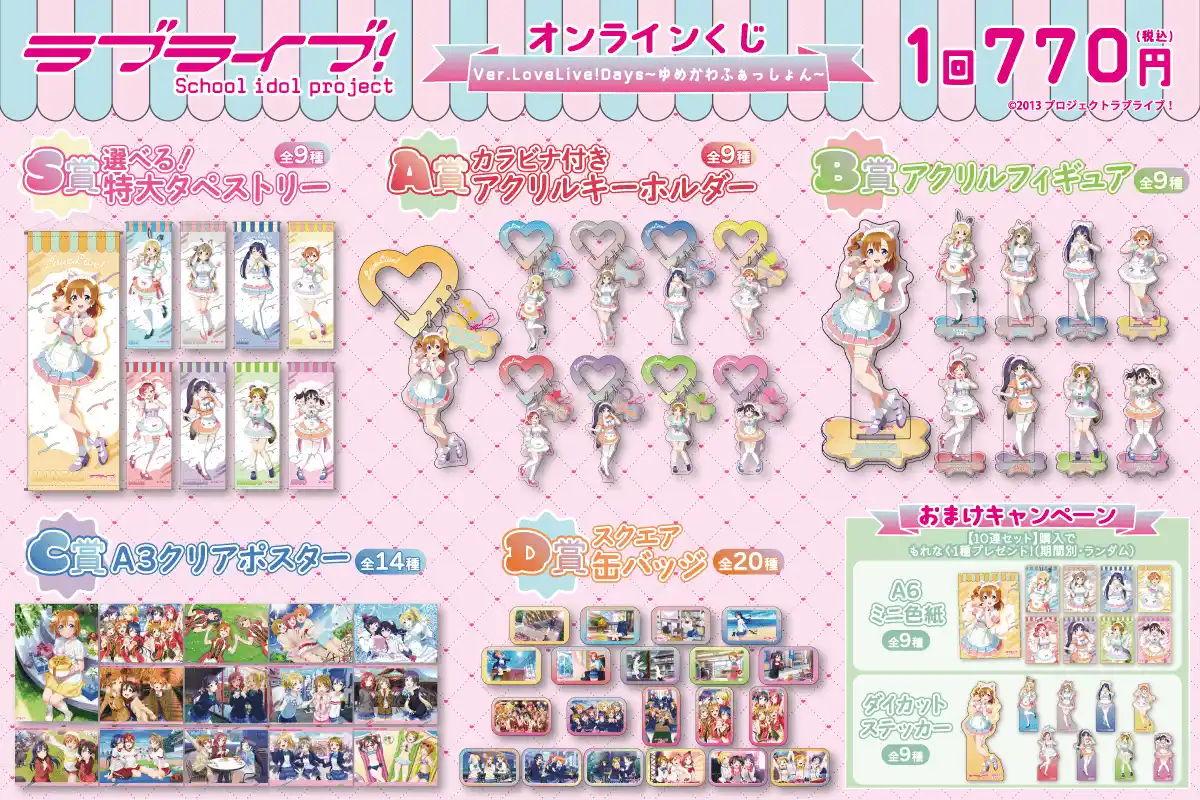 賞品は「LoveLive!Days」で活躍中のイラストレーター・未来電機先生による《ゆめかわ×メイド》をテーマとしたμ’sメンバーの新規描き下ろしイラストを使用したオリジナルグッズがメインとなります。個性あふれる各メンバーの描き下ろしイラストを使用した賞品や、これまで雑誌「LoveLive!Days」等の誌面を彩ったイラストを集めた賞品、さらに「LoveLive!Days」との連動おまけキャンペーンなど盛りだくさん! |