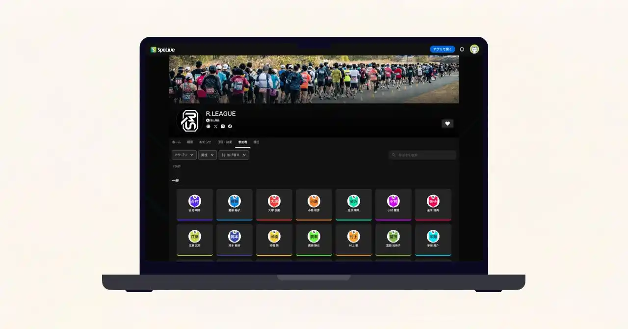 R.LEAGUEのSpoLiveページ:https://web.spo.live/tour/0UkKwBqaoG R.LEAGUEは2026年1月の開幕からわずか1ヶ月半で多数のランナーが参加登録し、急速に規模を拡大しています。SpoLive上では、参加するすべてのランナーに対し、プロスポーツリーグと同水準の個人プロフィールが自動で生成・蓄積されます。出場数、完走数、ベストタイム、平均タイム、獲得ポイント、全レース履歴。市民ランナーであっても、自分の記録と成長の軌跡をいつでも振り返ることができる環境を、リーグ開幕初日から実現しています。 |