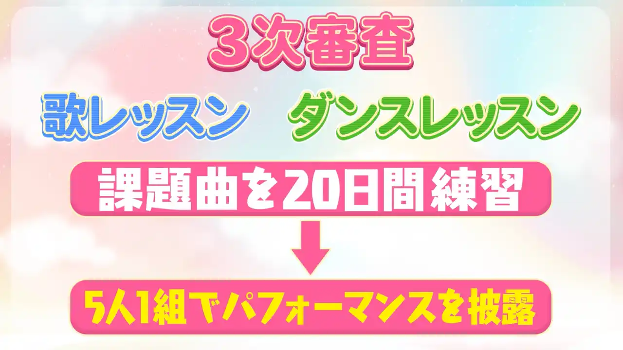 3次審査の内容は、ひめらぶの新曲『プリンセス7ヶ条』を課題曲とし、20日間で歌とダンスを完璧に仕上げるというもの。最終審査に進めるのは、10名のうちわずか「4名」という非常に狭き門です。候補者たちは自宅でも猛特訓を重ね、憧れの「ひめらぶ」加入を目指します。 |