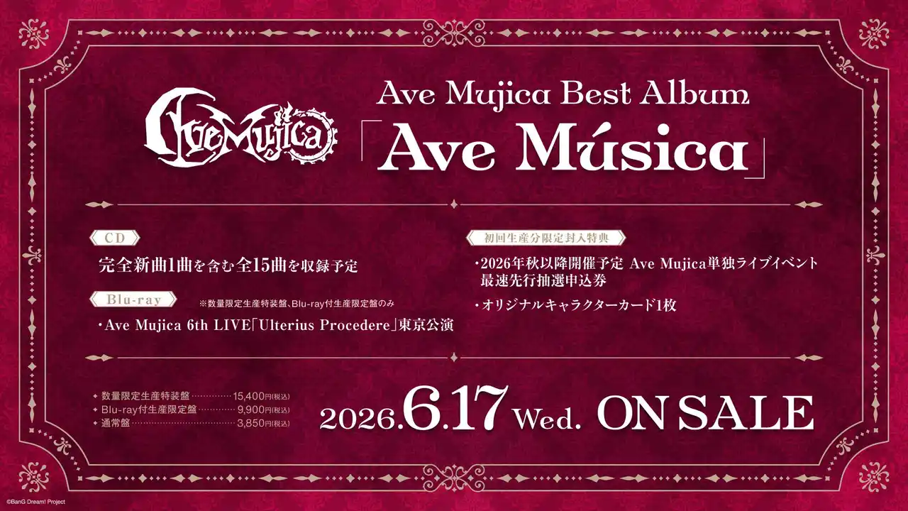 2026年6月17日(水)に、Ave Mujica Best Album「Ave Música」のリリースが決定しました。CDには、完全新曲1曲を含む全15曲が収録されます。 |