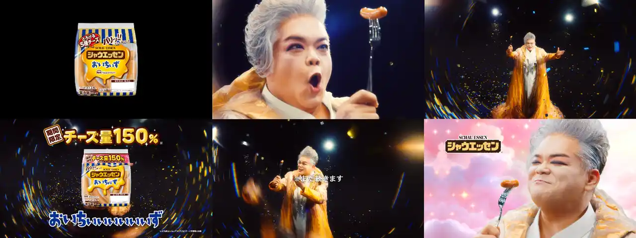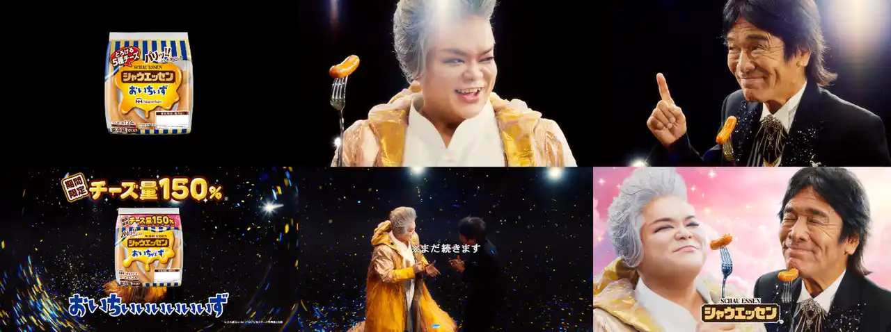 さらに発売に合わせ、『おいちぃず』からより濃厚な『おいちぃぃぃぃぃぃず』に変わったことをお伝えするために、世界的ソプラニスタ・岡本知高さんと国民的ソウルシンガー・松崎しげるさんが“チーズ歌唱”を披露する新CMを3本公開します。第1弾CMは、岡本さんが伸びやかなチーズ独唱を披露、第2弾では、松崎さんも参戦して、初となるデュエットが実現。さらに第3弾では、岡本さんと松崎さんがまさかの6人に増加し、6種のチーズに増量した『シャウエッセン(R)