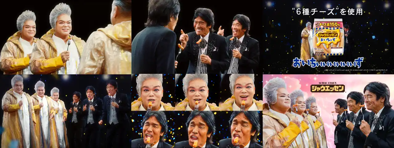 岡本知高さんと国民的ソウルシンガー・松崎しげるさんが「おいちぃぃぃぃぃぃず♪」の濃厚デュエットを披露。なんとお2人がデュエットするのはこれが初めてとなります。『おいちぃず』のパッケージ登場から始まり、岡本さんがアイコンタクトを送ったその先には…まさかの松崎さんが登場。視線を交わした瞬間、とてつもないインパクトで歌唱がスタート。カメラに向かってぐっと距離を詰めるように迫りながら、2人の表情も声量も“限界突破”へと加速。