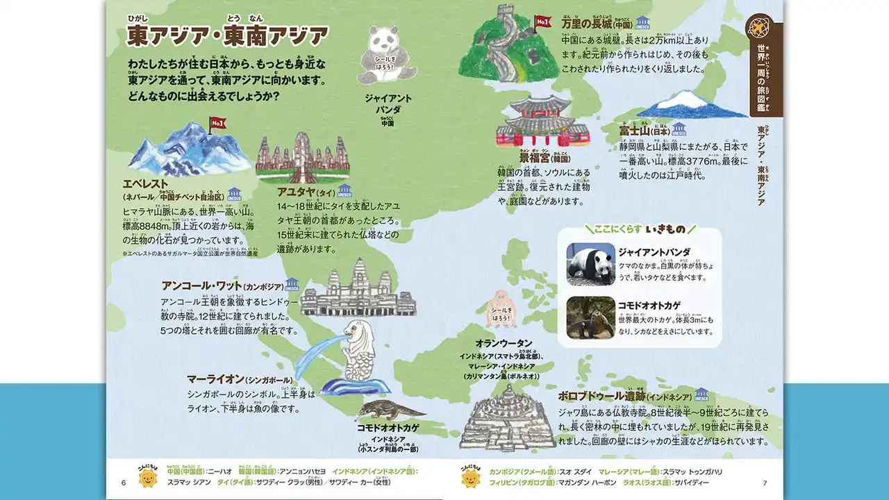 テーマは「世界一周の旅」。旅行の準備が整ったら飛行機に乗ってさあ出発です。アジア~ヨーロッパ~南北アメリカ~アフリカ~オセアニアを巡り、世界中の大自然や古代遺跡から、有名建築物、珍しい動物たちまで、海外の魅力と旅行の楽しさを感じられる情報が満載です。 |