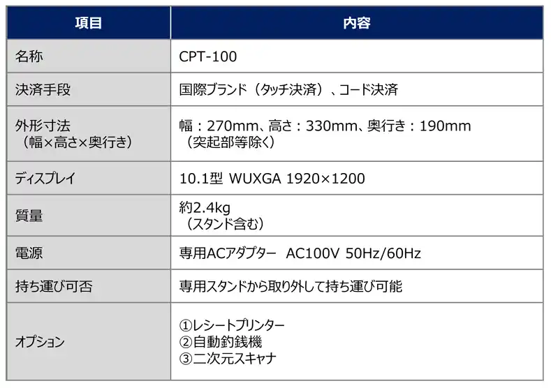 one」の提供を通じてCPT-100の決済基盤における利便性と安定性の向上を強力に支援します。両社は今後、周辺機器との連携拡大、遠隔管理、データ活用など、省人化・無人化を支援する機能強化にも取り組み、CPT 100を"業務効率化を支えるプラットフォーム"として継続的に進化させてまいります。 |