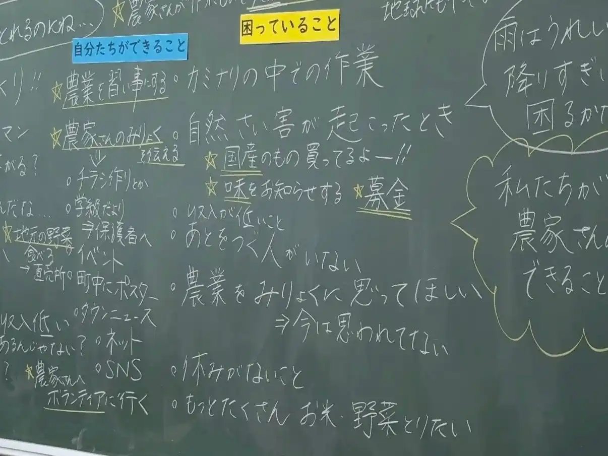 子どもたちの問いは、黒板の言葉で終わりませんでした。その問いはポスターとなり、市役所へ届き、そして畑へとつながっていきました。 |