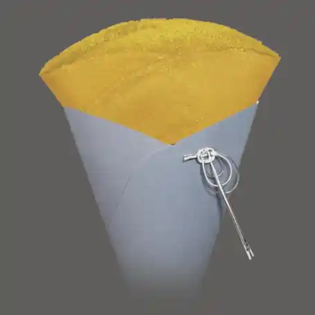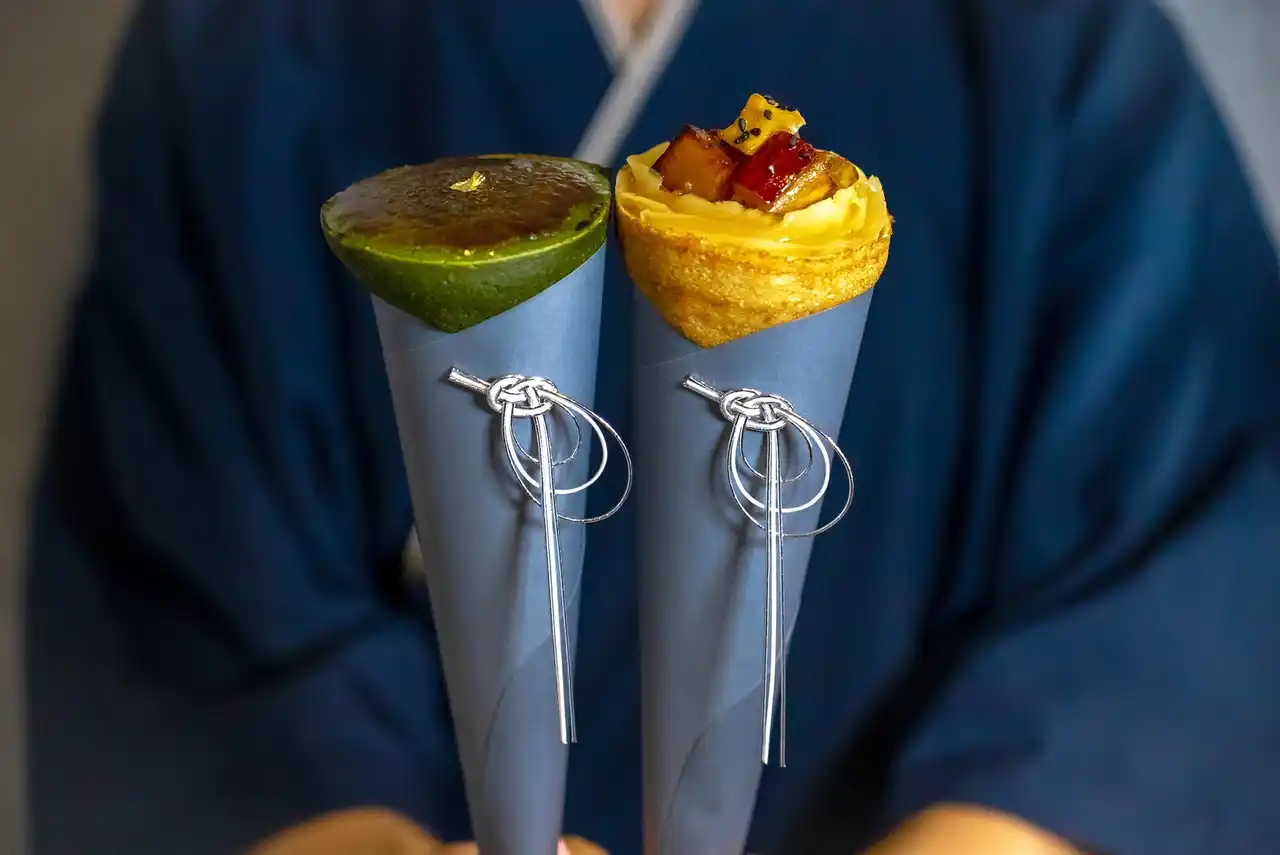 「たばねのし」のもう一つの特徴は、その繊細な包装です。クレープを包む包装紙には、石川県が誇る加賀水引が飾られています。五代目職人である津田六佑さんがひとつひとつ丁寧に手作りした水引は、伝統の技を現代に生かし、和の美しさを視覚でも感じていただけます。贈り物としても喜ばれる、その美しい包装も「たばねのし」の魅力の一部です。 |