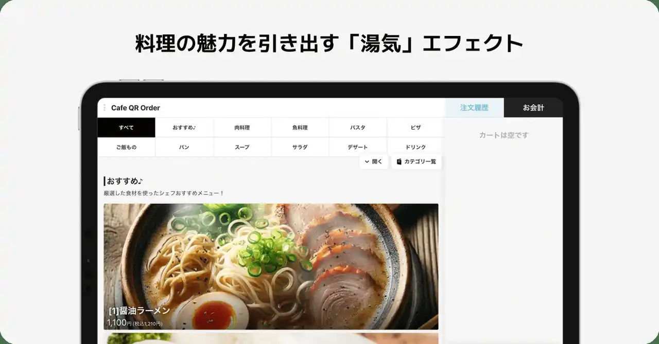 今回のアップデートでは、静止画のメニューに「湯気」のエフェクトを加え、デジタルならではの演出で料理の魅力を最大化。業務効率化と販促力強化を同時に叶えます。 |