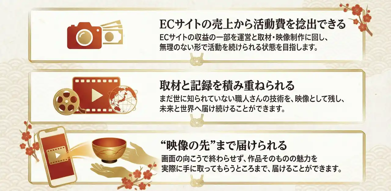 このプロジェクトは、私たち2人だけでは実現できません。 皆さまからのご支援は、単にECサイトを作るだけでなく、日本の職人・ものづくりの未来をつくることにつながります |