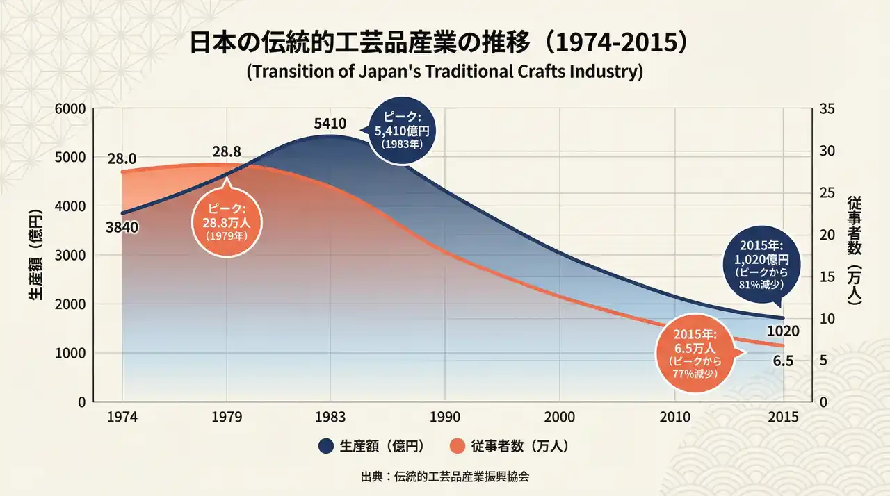 一般財団法人 伝統的工芸品産業振興協会の調査によると、伝統的工芸品産業の従事者数は、1979年の約28万8千人から2020年には約5万4千人へと、最盛期の5分の1以下にまで減少しています。 需要が伸びず、生産量が減る中で、職人の仕事は「生業」として成り立ちにくくなり、新しくこの道に入る人も減っています。このままでは、貴重な技術が静かに途絶えてしまう恐れがあります。 |