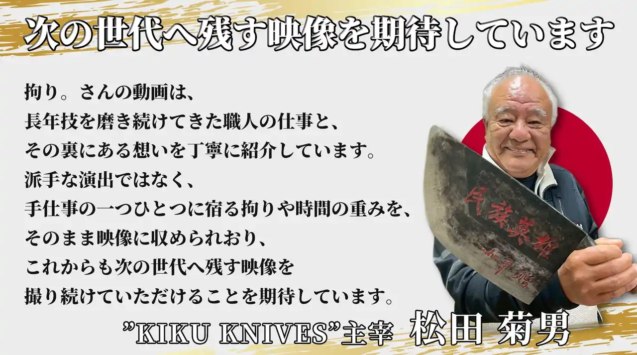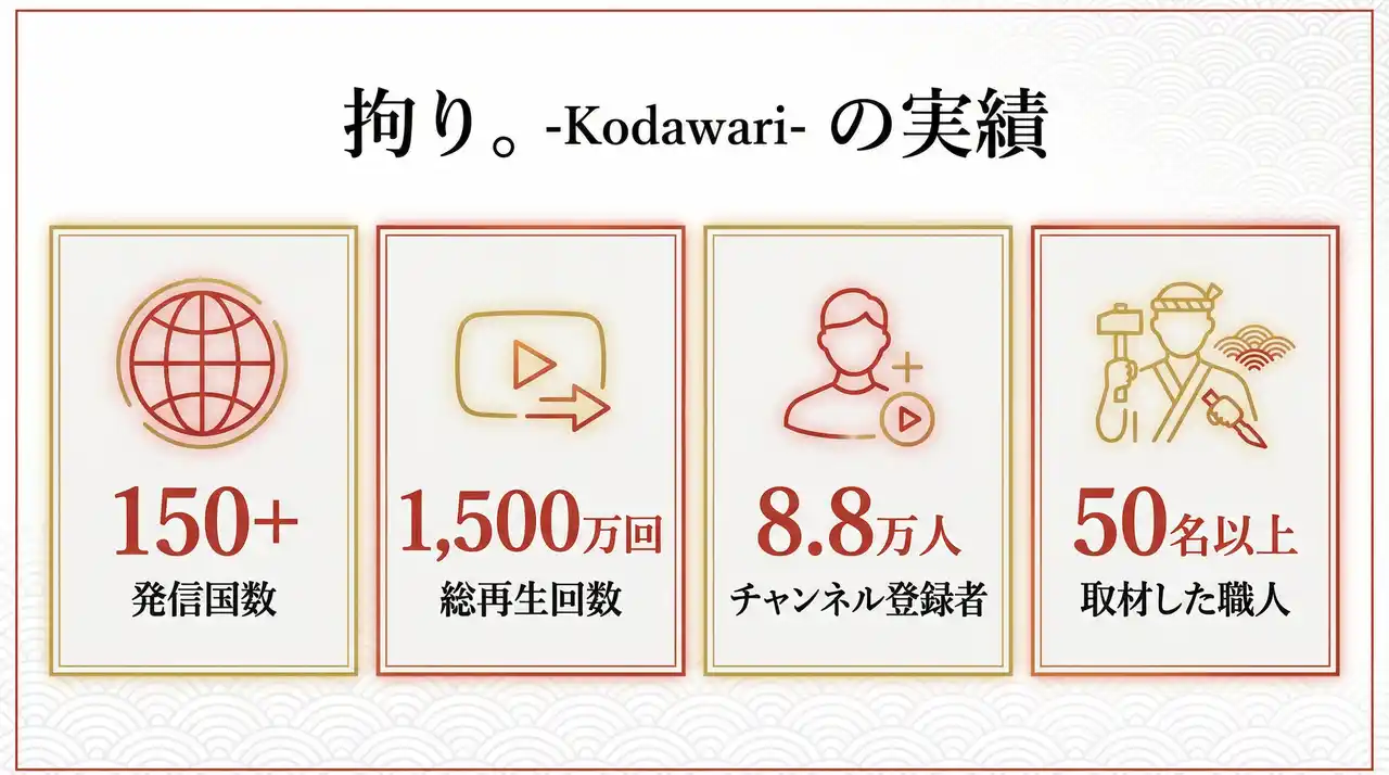 ・累計再生回数 :1,500万回以上 ・チャンネル登録者数:8.9万人 ・動画が届いた国と地域:約150カ国 ・これまでに取材した職人:50名以上 |