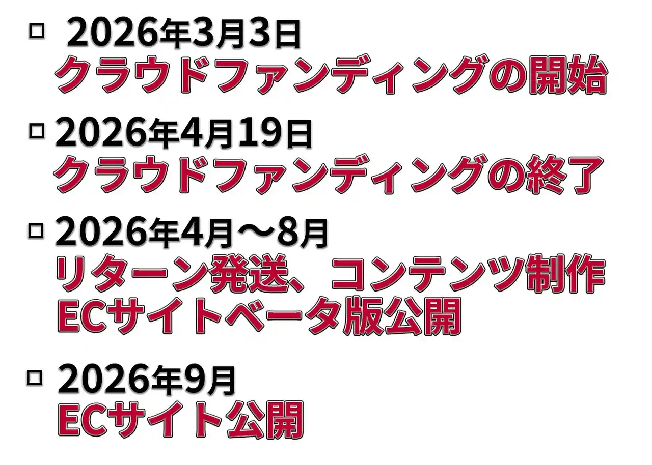 ・2026年4月~6月:リターン発送、コンテンツ制作、ECサイトベータ版公開 ・2026年7月:ECサイト公開 |