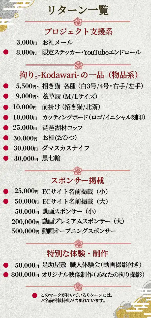 ご支援者の皆さまには、ご支援額に応じて特別なリターンをご用意しています。 全国の選りすぐりの職人が作った作品や、スポンサー向け・体験型のリターンなど、『拘り。-Kodawari-』らしいラインナップを揃えました。 |