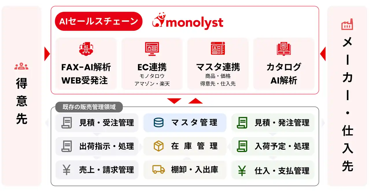 2025年4月より製造業向けAIセールスプラットフォーム 「monolyst(モノリスト)」の提供を開始。本システムは、紙カタログからスペックや商品画像の取得・管理を行う商品情報管理システムを中心として、FAX AI解析、Web受注システム、市場価格調査、EC連携、売上分析などマルチプロダクトを展開。機械工具、建材、自動車・バイク部品の卸やメーカーへの導入が続々と進む。 |