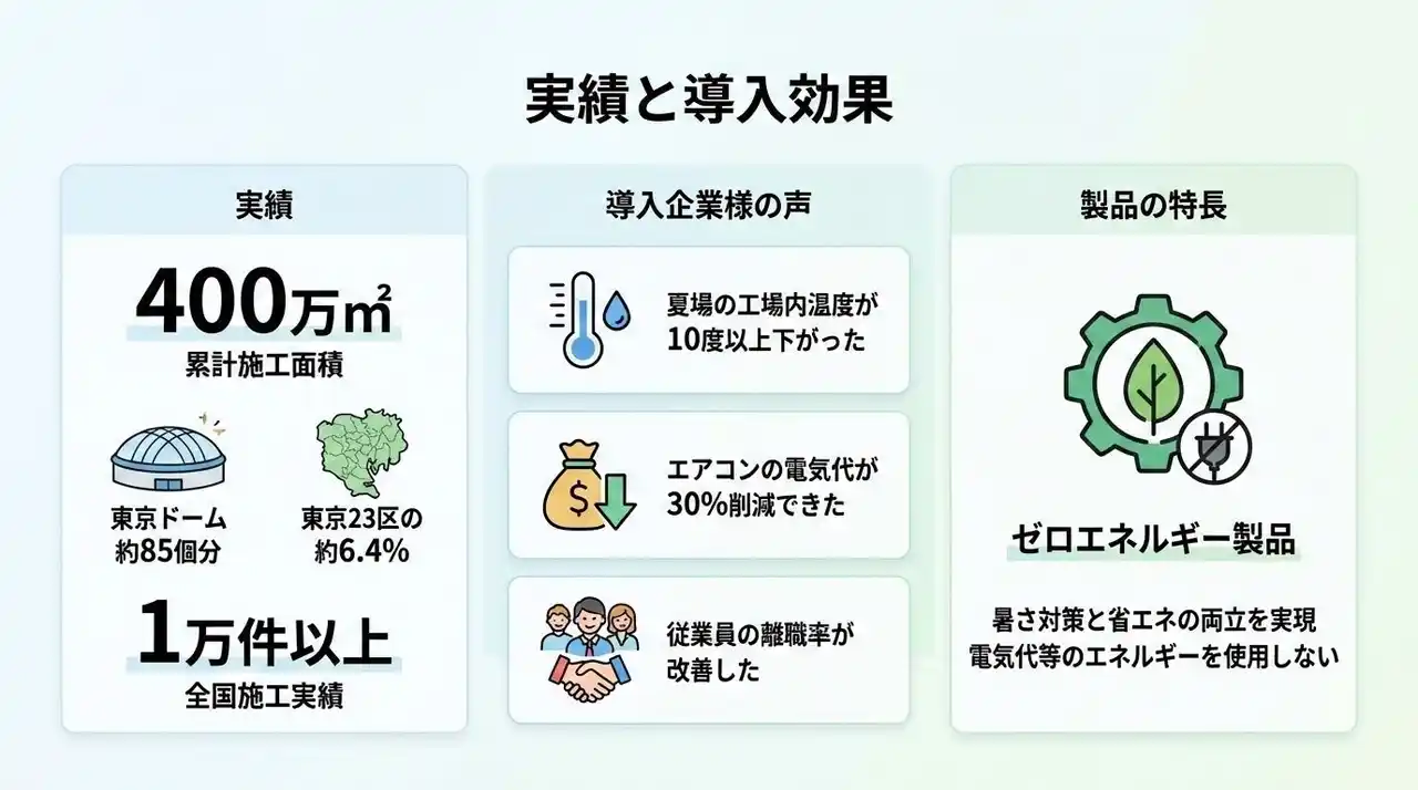 累計400万平方メートル は、東京ドーム約85個分、東京23区の面積の約6.4%に相当します。これまでに全国1万件以上の施工実績があり、工場・倉庫の暑さ対策や省エネ対策、住宅の快適性向上に貢献してまいりました。 |