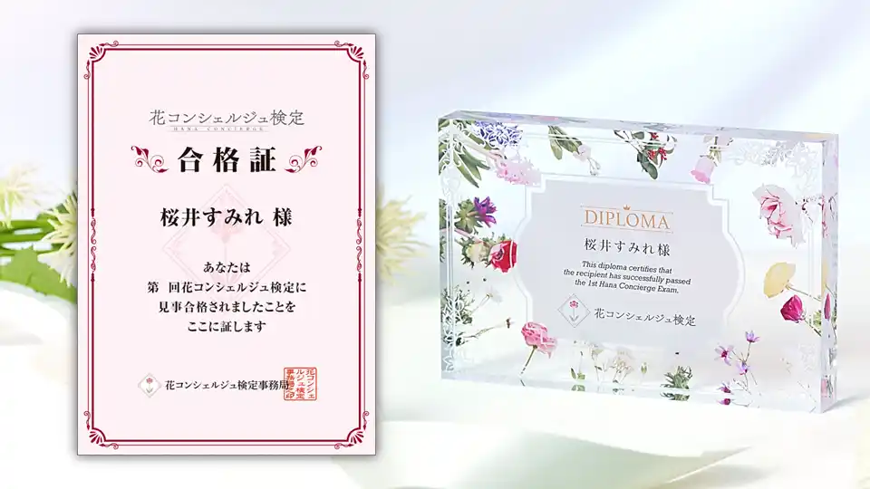 見事合格された方には、その成果を称え、もれなく「合格証」を贈呈いたします。 さらに、希望者の方に限り、世界に一つだけのお名前入り「特製ディプロマ」を限定販売いたします。透き通ったアクリルブロックに色とりどりの花をあしらった、気品あふれるデザインは、第1回でも大変ご好評をいただきました。 栄えある合格の証として、また花と向き合った楽しい学びの時間の思い出として、お部屋に飾って長くお楽しみいただける一品です。 |