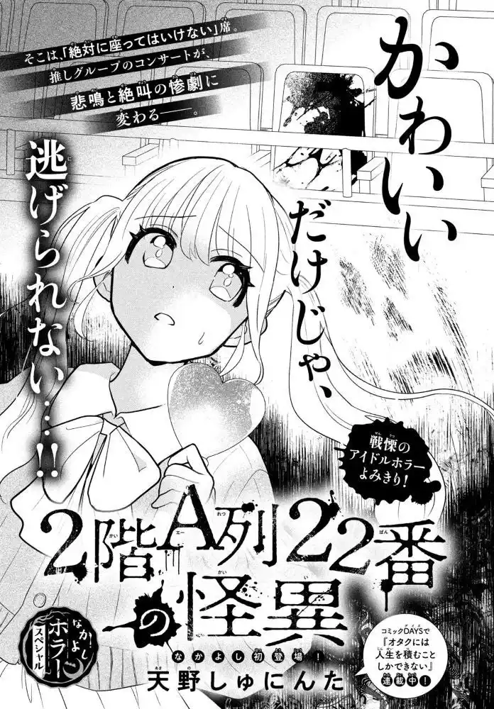 そこは、「絶対に座ってはいけない」席―――。推しグループのコンサートに行ったななみが座った席は、アイドルになりたい女の子が転落死したという、いわくつきの席で…。恐怖と戦慄のアイドルホラー『2階A列22番の怪異』(天野しゅにんた)。 |