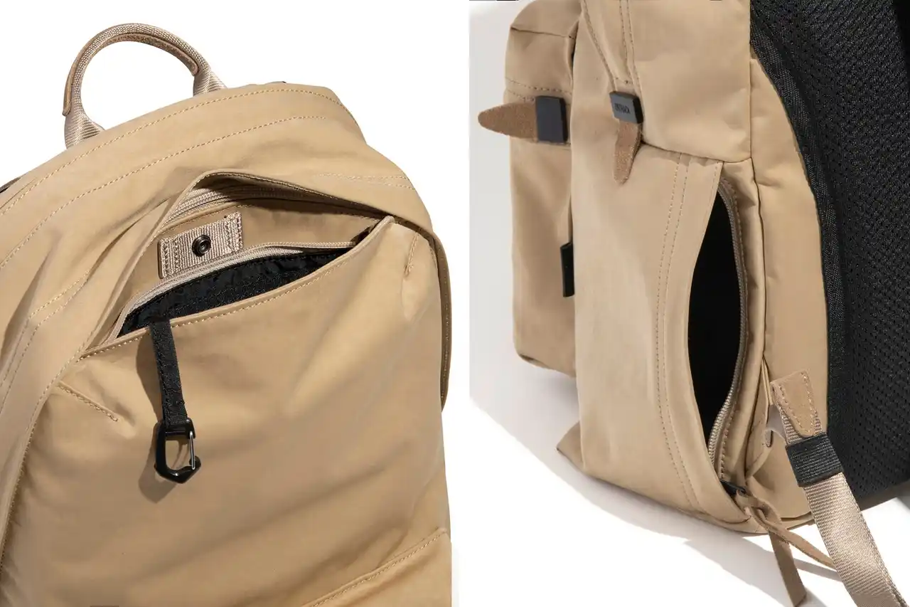 フロント上部には外から見えにくいトップポケット、両サイドにはスマホやパスケースの出し入れに適したオープンポケットとファスナーポケットを配置。 |