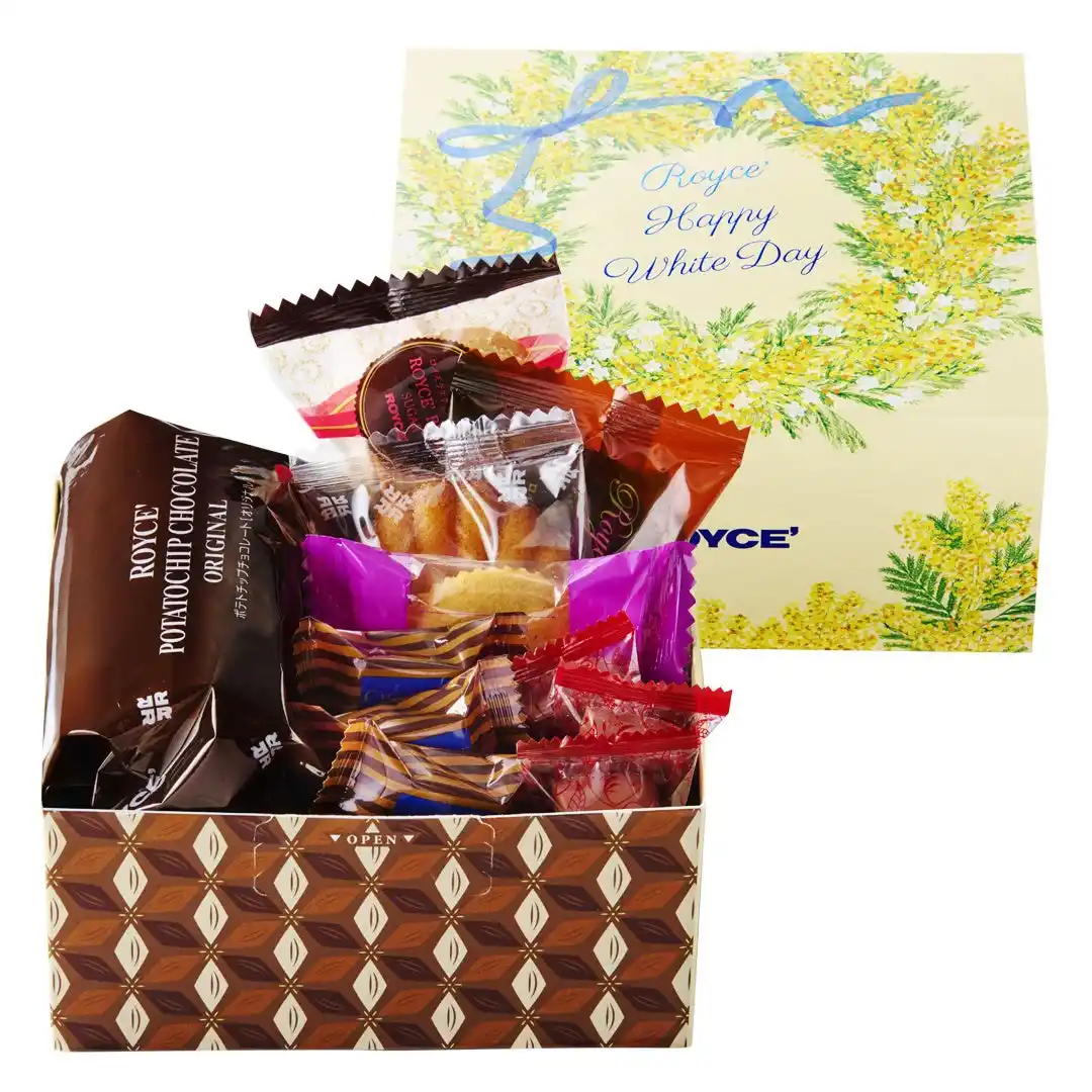 ロイズの人気スイーツを贅沢に詰め合わせた、華やかなアソートボックス。ポテトチップチョコレートをメインに、バラエティ豊かな焼き菓子やチョコレート菓子を詰め合わせ、「Royce' Happy White Day」の文字とミモザのリースをデザインにあしらったスリーブを付けました。ひと箱で多彩な味わいを楽しめる、ロイズの魅力が詰まった特別なセットです。 |