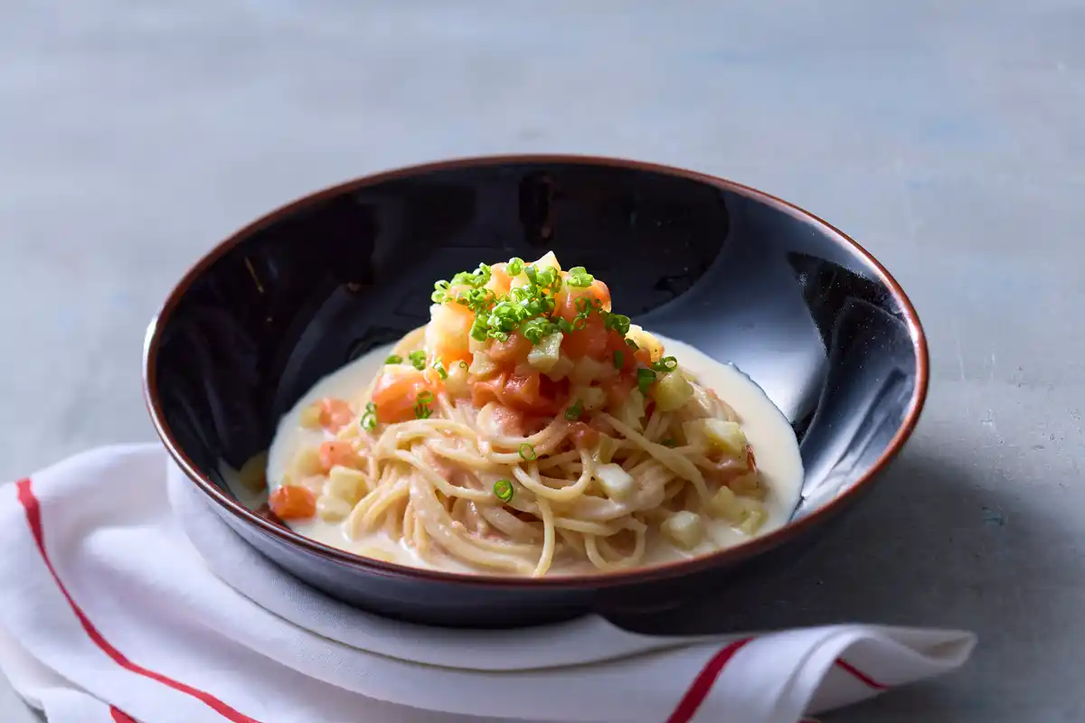 クリーミーなじゃがいものスープに、旨みあふれるたらことサーモンをあわせた冷製スパゲティ。素材それぞれのやさしい味わいが調和し、最後の一口まで飽きずにお楽しみいただけます。 |