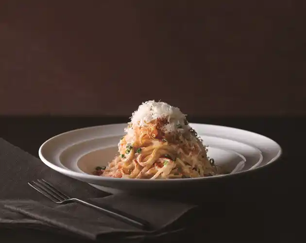 博多名物“辛子明太子”×カルボナーラの新しい組み合わせ。辛子明太子の辛みと旨みが 濃厚なカルボナーラに絶妙にマッチして、一度食べるとクセになるひと皿です。 |
