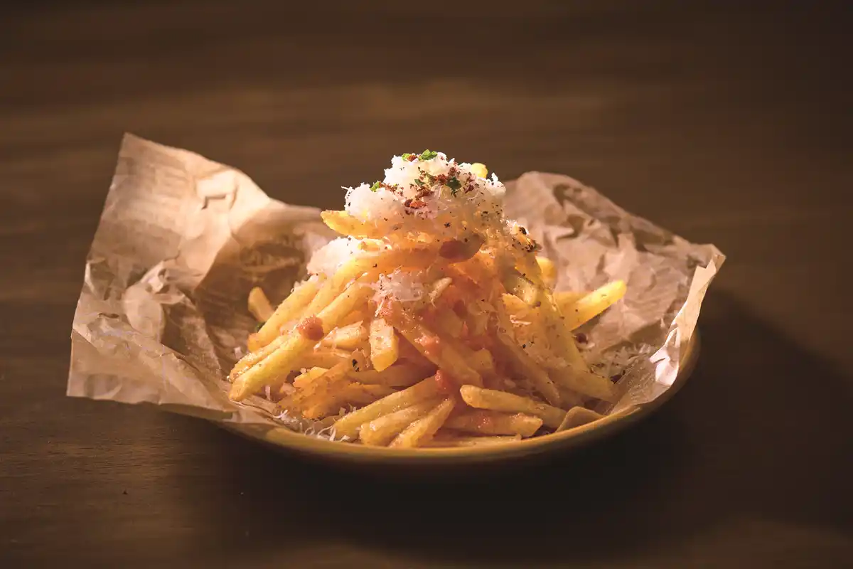 博多名物“辛子明太子”とバターがよく絡んだ熱々のポテトに、パルミジャーノをトッピング。やみつきになるおいしさです。 |