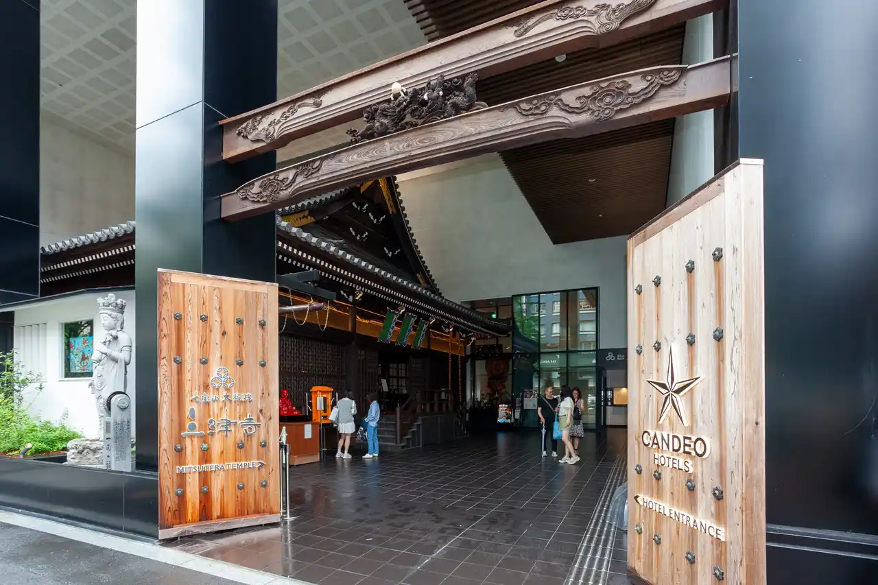 本取り組みは、大阪の大動脈・御堂筋沿いに位置する三津寺の境内地において、寺院・ホテル・店舗一体型の複合施設を整備したものです。江戸時代末期(1808年)建立の木造本堂を曳家により保存しながら、その上部に都市機能を重層化することで、歴史的建築の保存と持続可能な寺院経営の両立を図った、都市型寺院の新たなモデルを提示しました。本堂を中心に据えた3層吹抜けの境内空間は、御堂筋から直接アクセス可能な構成とし、寺院とホテルが境内を介して緩やかにつながる計画としています。これにより、まちを行き交う人々が自然に立ち寄り、日本文化に触れられる、開かれた都市空間を実現しました。 |