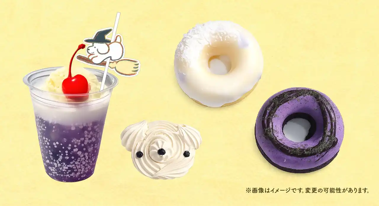 会場にはちいさなカフェスタンドがあります。そこでご用意するのは、絵本をモチーフにした「魔女のクリームソーダ」と、「魔女のドーナッツ」、「犬のドーナッツ」です。「魔女のクリームソーダ」は魔女をイメージした紫色。本展限定のかわいいストローマーカーも必ずついてきます。また、奈良県橿原市にある「cafeひそひそ」さんがつくる「犬のメレンゲ」つきもご用意します。 |