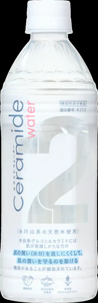 谷川山系の天然水に、機能性関与成分「米由来グルコシルセラミド」を配合しました。米由来グルコシルセラミドには肌が乾燥しがちな方の肌の潤い(水分)を逃しにくくして、肌の潤いを守るのを助ける機能があることが報告されています。水分補給がセラミド配合により肌のうるおいケアになる、毎日飲む水を置き換えるだけの、気軽に始められる新インナーケア習慣です。 |