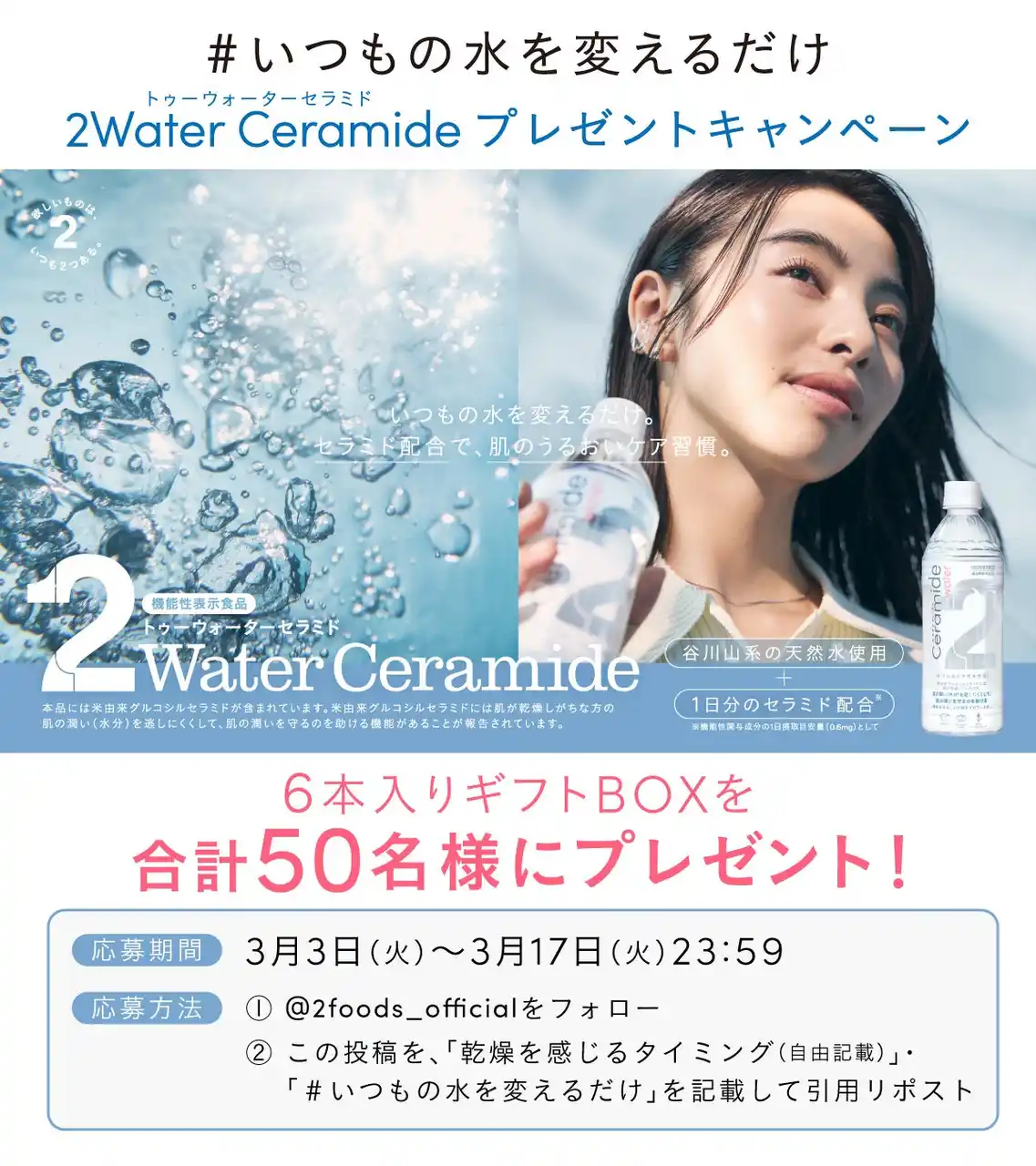 また、2Water Ceramideの一般発売を記念し、2foods公式Xにて「#いつもの水を変えるだけ 2Water Ceramide プレゼントキャンペーン」を3月3日(火)より実施いたします。 |