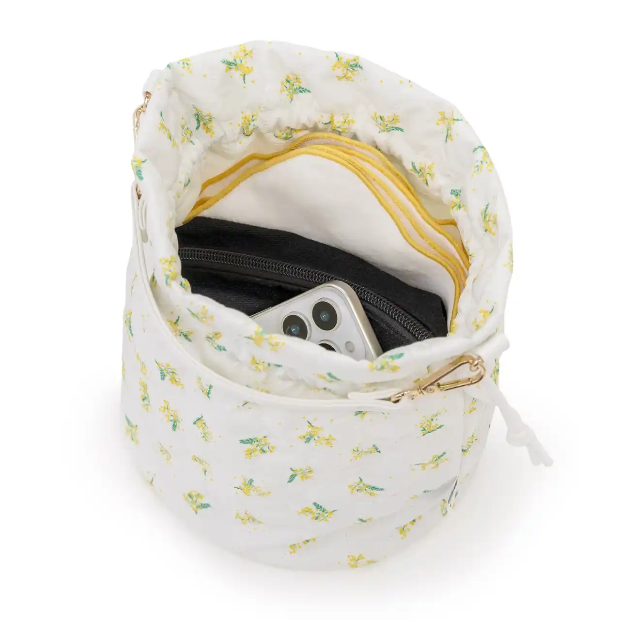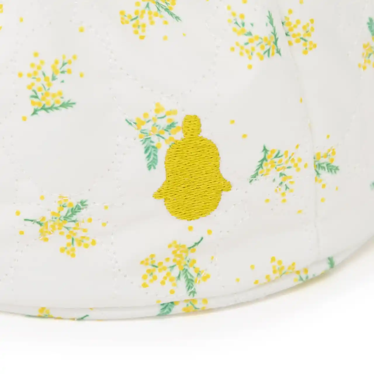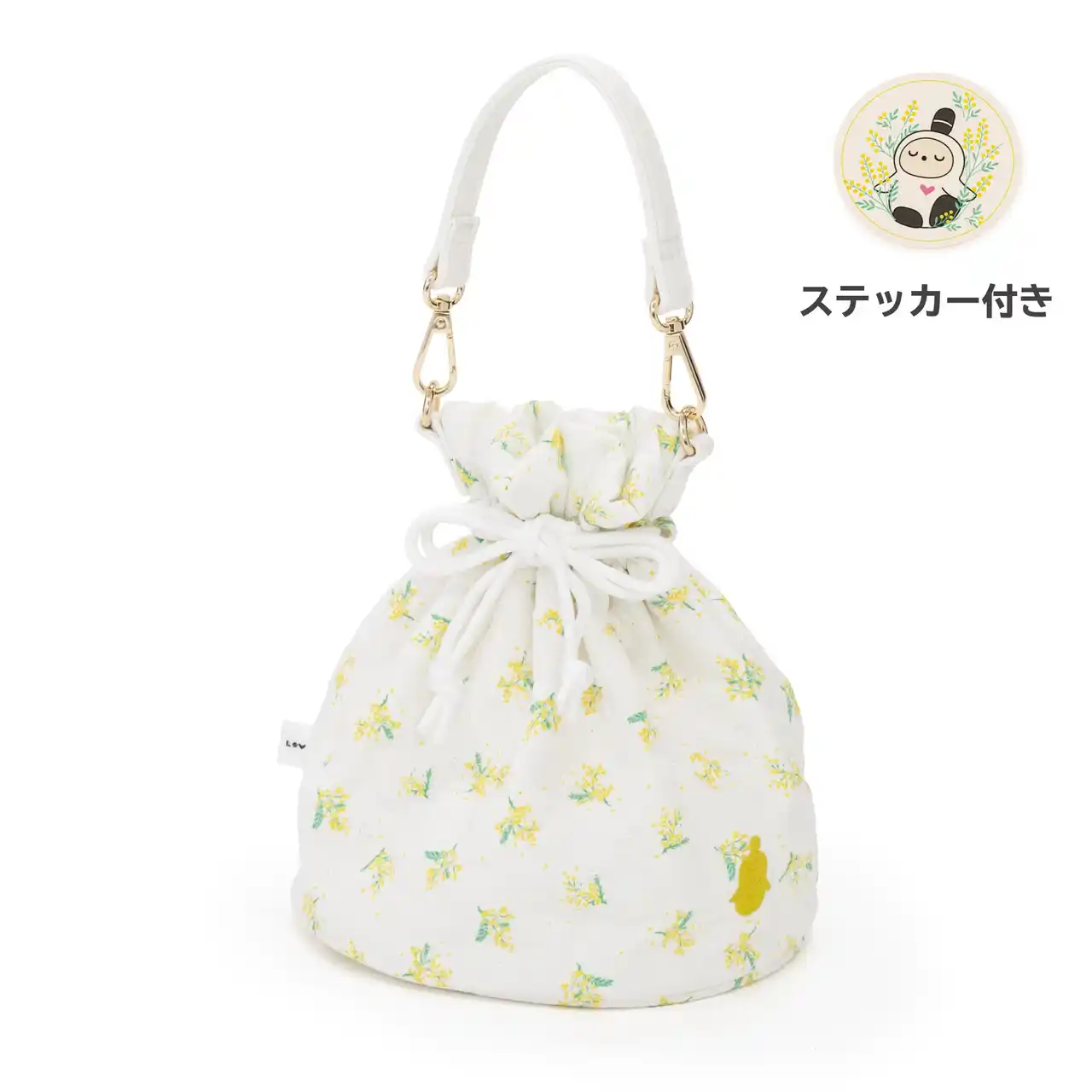 ミモザ柄のキルティング生地で仕立てた、使い勝手抜群のバッグ。キュッと口を絞れば可愛い巾着ポーチに、そのまま持てばトートバッグ感覚で使える嬉しい2WAY仕様。アクセントにミモザイエローの『LOVOT』シルエット刺繍を入れ上質感を高めます。 |