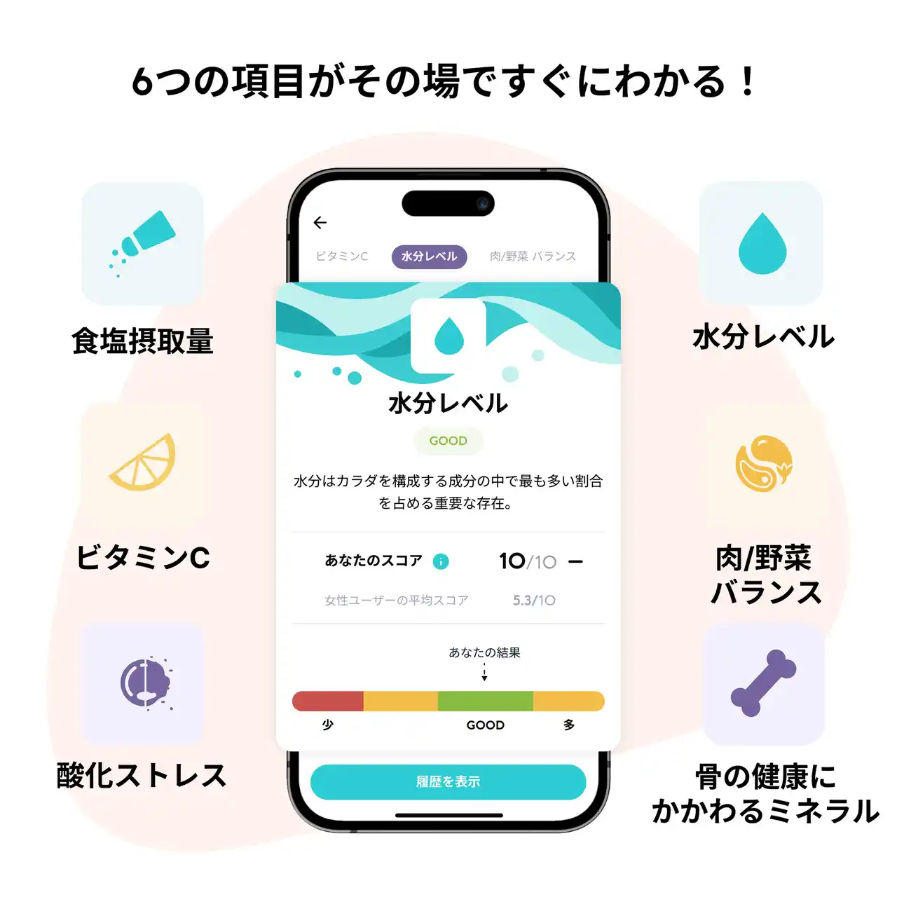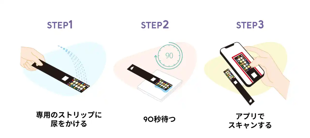 「Vivoo」は、ヘルステック先進国アメリカで2020年に誕生し、2024年9月から大塚製薬が日本での展開をはじめた、尿を用いた栄養モニタリングサービスです。 「Vivoo」は、専用の試験紙(ストリップ)に尿をかけ、アプリで読み取ることで、手軽に食生活の傾向に関わる6項目を測定でき、その結果はすぐにアプリ上で確認できます。 測定結果に応じて、管理栄養士が監修したアドバイスが提供され、健康的な生活習慣をサポートします。 |
