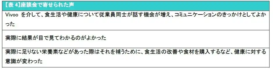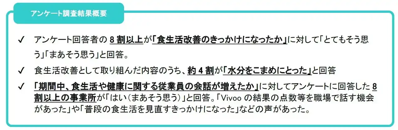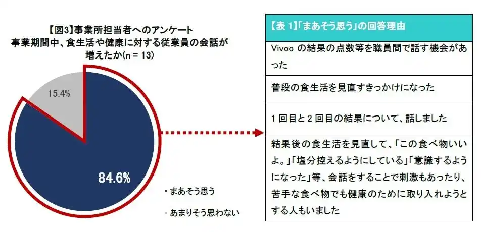 2.アンケート回答に回答した参加事業所の8割以上が「食生活や健康に関する従業員の会話が増えた」と回答。「Vivooの結果の点数等を職場で話す機会があった」や「普段の食生活を見直すきっかけになった」などの声