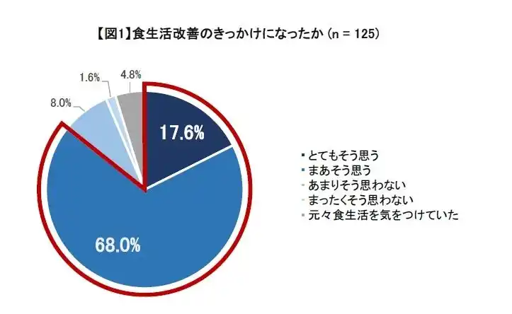 1.アンケート回答者の8割以上が「食生活改善のきっかけになった」と回答。自身の食生活を見直すきっかけとなり、特に水分レベルについては回答者の約4割が「水分をこまめにとった」と回答 |