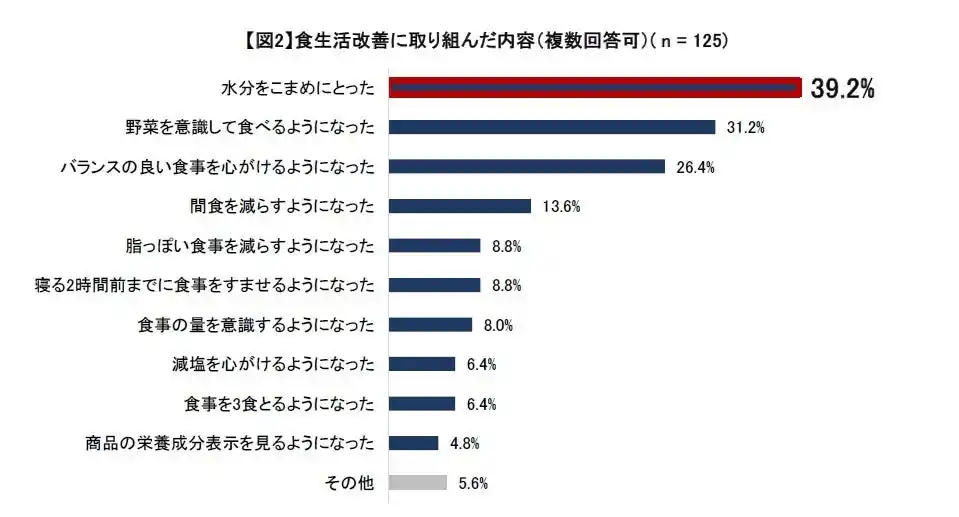 「食のチャレンジ2025」の参加者に対して今回の取り組みが食生活改善のきっかけとなったかを聞いたところアンケート回答者の8割の人が「少なからずそう思った」と回答しました【図1】。「Vivoo」を活用したことで自身の食生活を見直すきっかけになったことが見て取れます。さらに食生活の改善に取り組んだ内容も聞いたところ、約4割が「水分をこまめにとった」と回答しました【図2】。水分、野菜の摂取に加え、間食や油っぽい食事を減らすなど、Vivooのテスト結果項目以外にも意識を広げた人がいました。 |