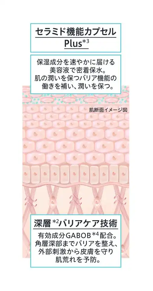 「深層*²バリアケア技術」採用により、角層深部までバリアを整え、外部刺激から皮膚を守り、肌荒れを予防します。 |