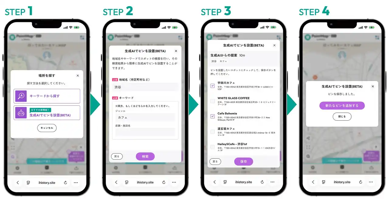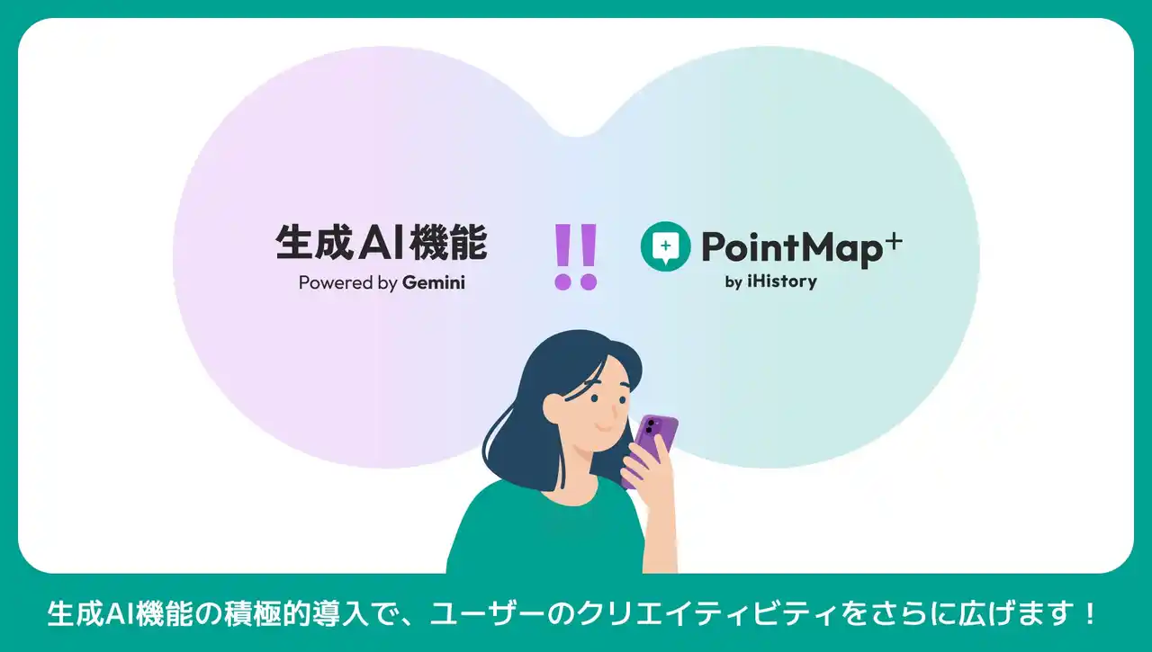 スタートアップのiHistory Inc.(本社:東京都港区、CEO:中野一誠、以下、iHistory Inc.)は、 誰でも簡単にオリジナルのデジタルマップが作成できるWebサービス『PointMap+(ポイントマッププラス)』に、地域名やキーワードを使い場所候補を自動生成できて、より簡単にピンの設置ができるようになる「生成AI機能」を追加いたしました。Googleの生成AI『Gemini』を活用した新機能になります。 |