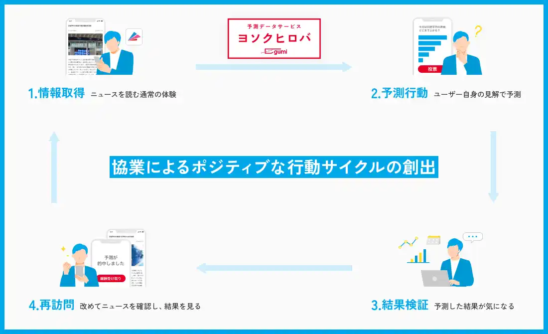 具体的には、ニュースによる「情報取得」から始まり、それに基づく「予測行動」、その後の「結果検証」、そして検証のための「再訪問」という一連のサイクルを、サービスを通じて提供してまいります。 |