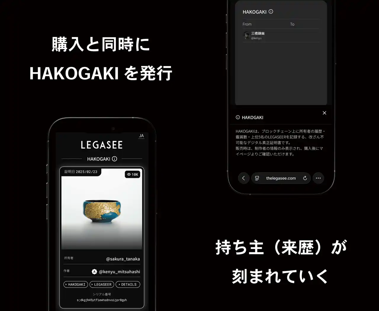 LEGASEEでは、すべての作品にデジタル真正証明書「HAKOGAKI」が発行されます。 |