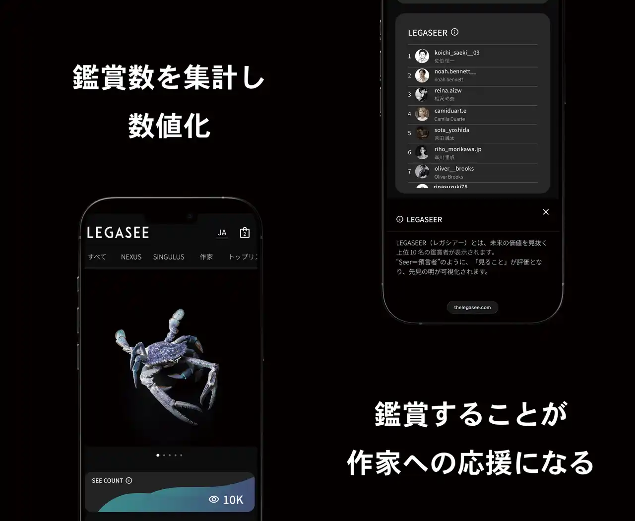 LEGASEE(レガシー)が提案するのは「価値が来歴として残る」のではなく、「来歴が価値を生む」という考え方です。作家の制作で終わらず、誰が見て、誰が選び、誰が持ち、どう受け継いだか--その積み重なりが作品の歴史になる。LEGASEEは全作品にデジタル真正証明書「HAKOGAKI」を発行し、鑑賞や所有のストーリーが作品史として刻まれていく体験を提供します。今後は、個展などオフラインでの活用、海外作家・海外ユーザーの参加拡大、二次流通(リセール/譲渡)も段階的に予定しています。 |