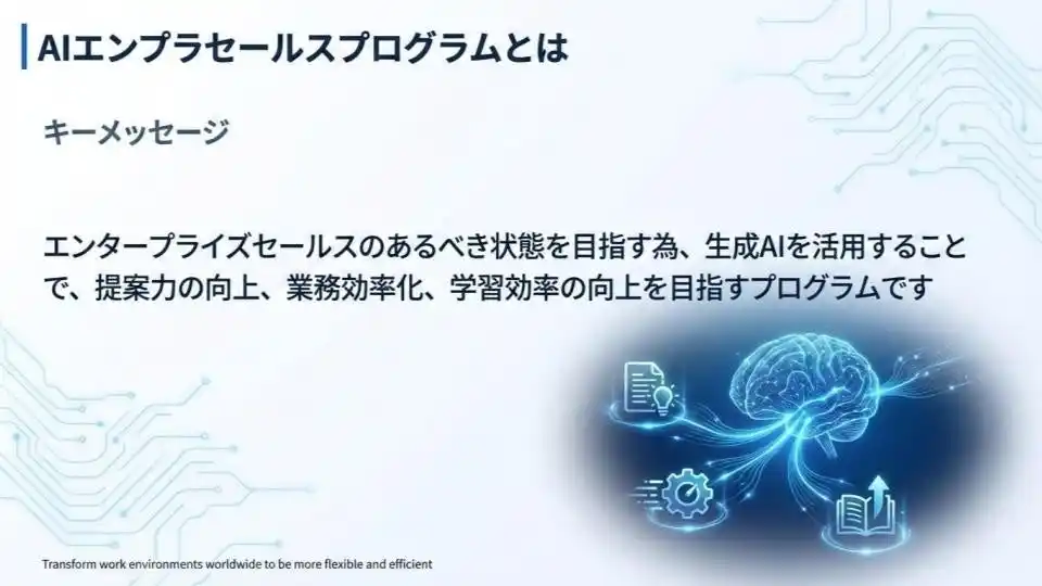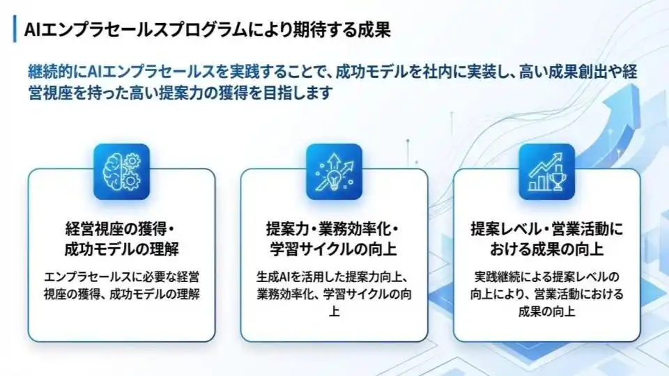 本プログラムは、単なるAI研修ではなく「AI×エンタープライズセールス」という具体的な職域に特化しているのが特徴です 。生成AIを提案資料の作成や市場動向の分析に組み込むことで、業務効率化のみならず「提案の質」そのものを劇的に進化させ、次世代の営業スタイルへの転換を支援します 。 |