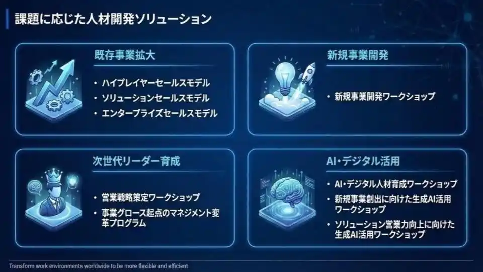 その他にも、成長戦略の実現に向けた営業組織変革に寄与する、研修プログラムやワークショップをご用意しております。事業と組織を力強く牽引できる次世代マネジメント人材を育成したい、組織全体の営業力を強化したい、エンタープライズセールスやソリューションセールスの型を導入したい、AI・デジタル技術を活用し提案力レベルの向上や業務効率化を行いたいなどの課題をお持ちの企業様を対象にしております。 |