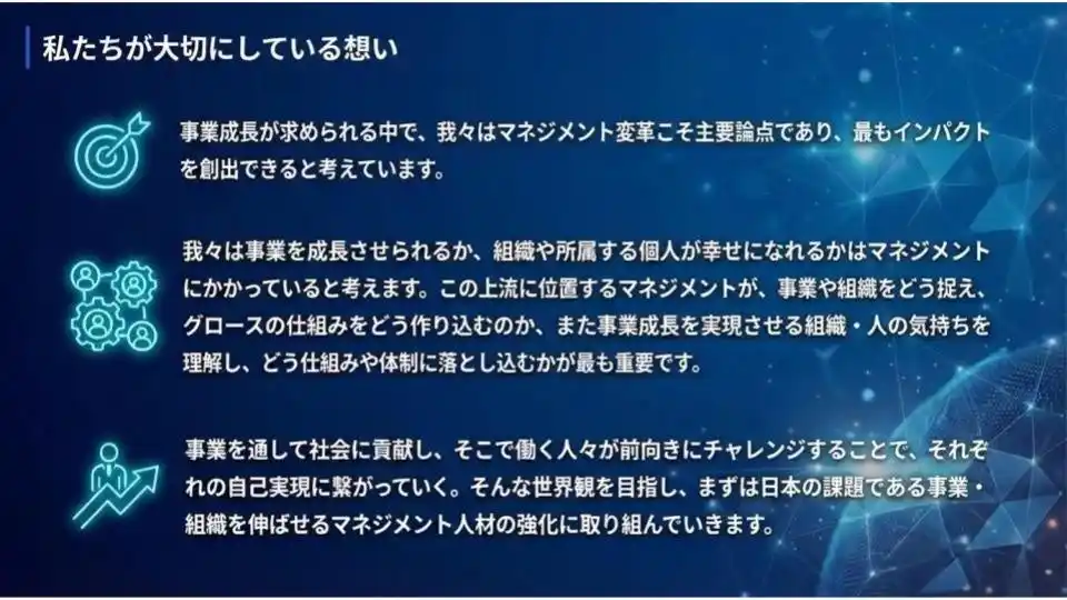 「マネジメントを変革し、新時代を切り拓く」をミッションに掲げ、2025年8月より事業を開始いたしました。 戦略・人的資本・テクノロジーを融合させ、企業価値を向上させるソリューションを提供します。 |