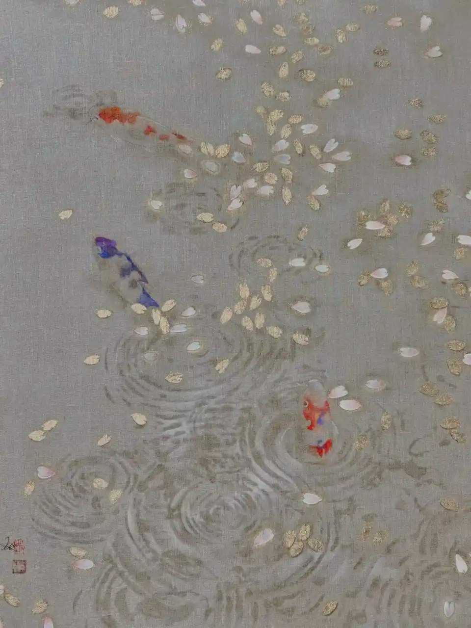 張 媛媛「桜鯉図」麻布、エンカウスティーク、岩絵具、金箔 |