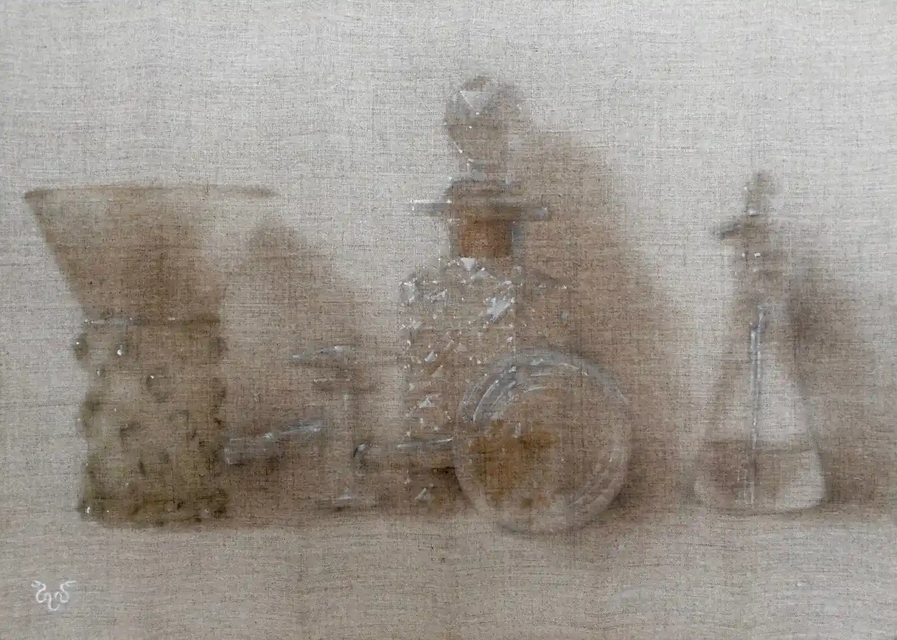 赤木 範陸「アレンビックとガラス器の静物」麻布、エンカウスティーク |