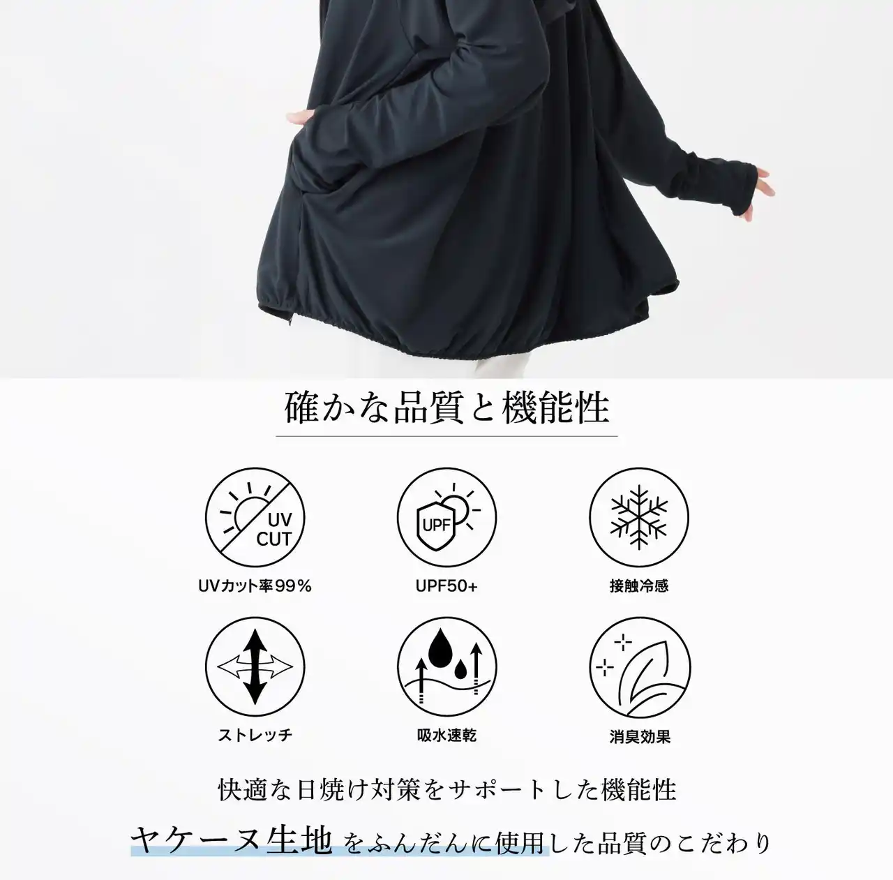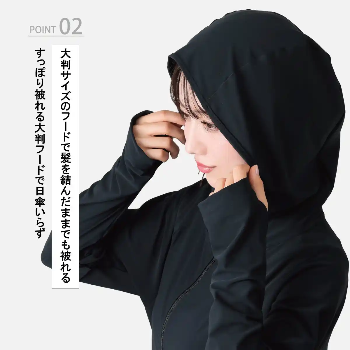 ゆとりのある大判フードを採用し、髪を結んだままでもすっぽりとかぶれる設計。顔まわりまでしっかり覆い、外出時の強い日差しから守ります。日傘を差しにくいシーンでも活躍します。 |