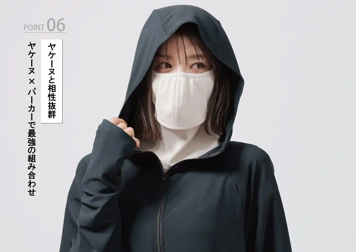 フェイスカバー「ヤケーヌ」と組み合わせることで、顔から首、腕まで広範囲をカバー。 |