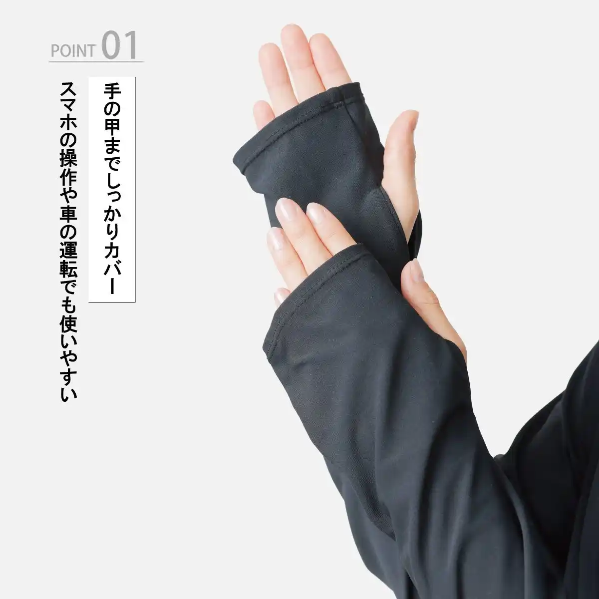 袖口は手の甲まで覆う設計で、日差しが当たりやすい手元までしっかりガード。指先は自由に動かせる仕様のため、スマートフォンの操作や車の運転、自転車のハンドル操作も快適に行えます。 |