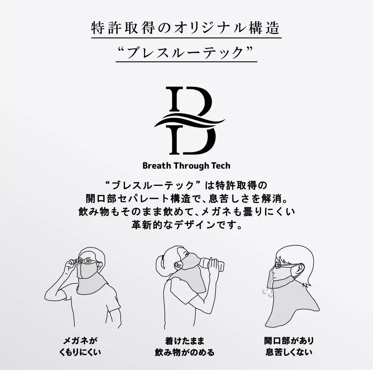 ヤケーヌは、息苦しさを感じにくい構造が特徴のフェイスカバーです。特許取得のオリジナル構造「ブレスルーテック」は、上下二部式のセパレート設計。吐いた息が下に抜けるよう設計され、水分補給やメガネが曇りにくい革新的デザインです。 |