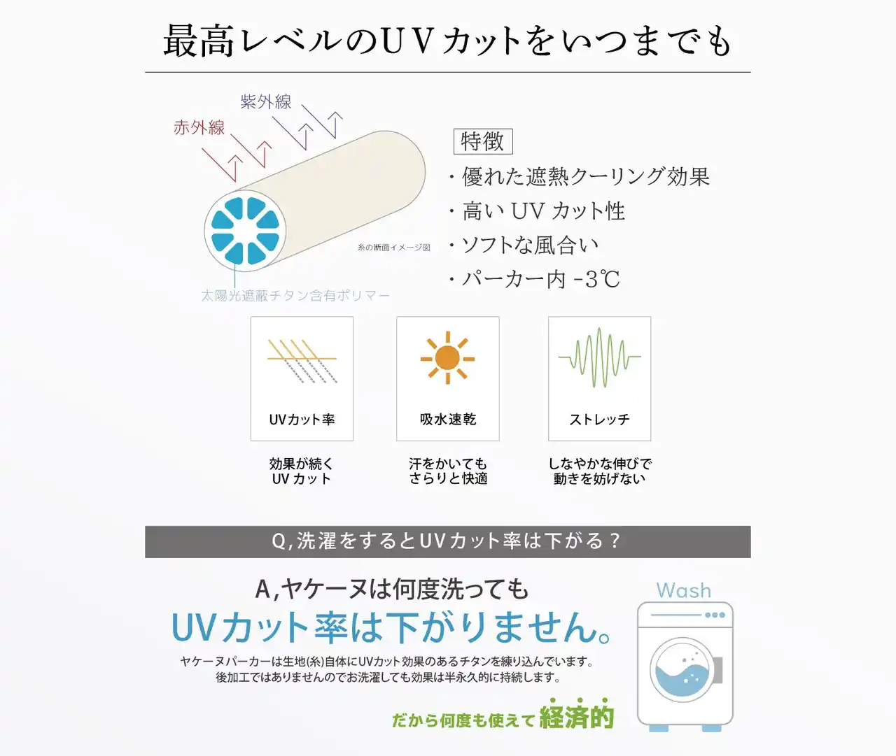 ヤケーヌは、安心・安全の日本製高機能糸を使用し、生地(糸)自体にUVカット効果のあるチタンを練り込んでいます。後加工ではありませんので、洗濯しても効果は半永久的に持続します。 |